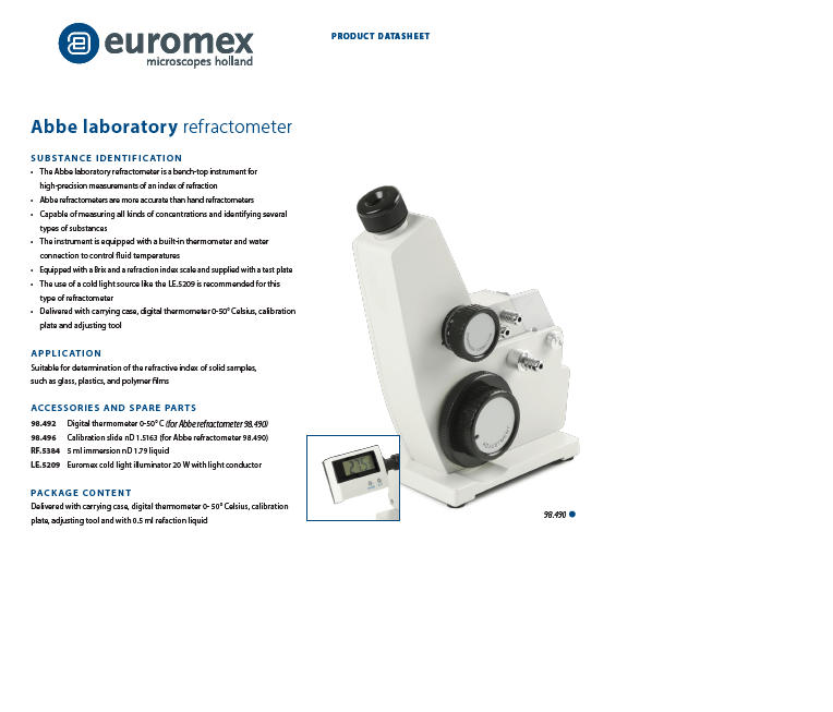 The Abbe laboratory refractometer is a bench-top instrument for high-precision measurements of an index of refraction. The Abbe refractometer is also suitable for determination of the refractive index of solid samples, such as glass, plastics, and polymer films.
