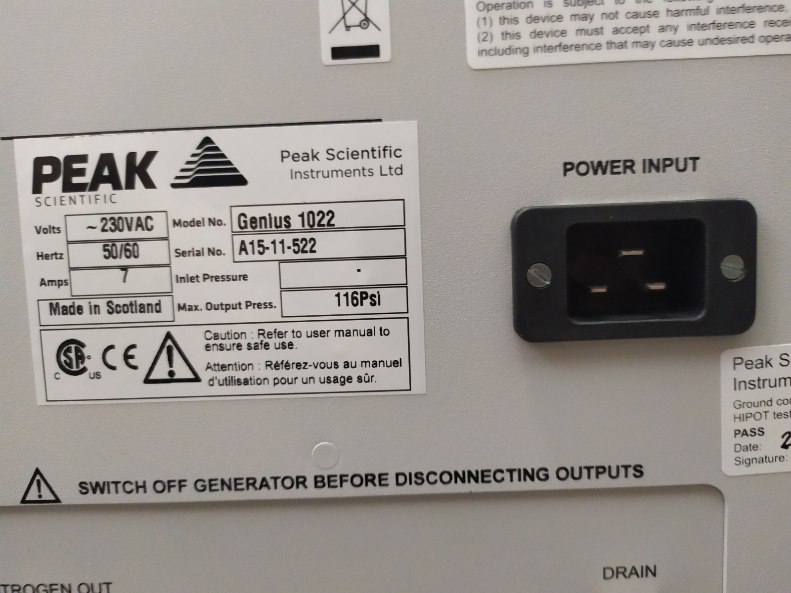 Peak Scientific Instruments Nitrogen Generator Genius 1022, Refurbished
